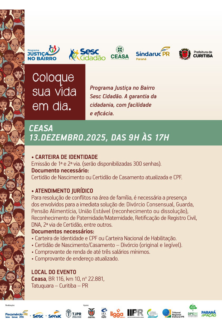 A Ceasa Curitiba será palco, em 13 de dezembro, de um grande evento social. É o Programa Justiça no Bairro Sesc Cidadão que dá acesso a diversos serviços de cidadania. Haverá também a esperada celebração do casamento coletivo. A população terá acesso à emissão da Carteira de Identidade (1ª ou 2ª via) e a serviços jurídicos familiares. Para confecção do documento serão emitidas 300 senhas.