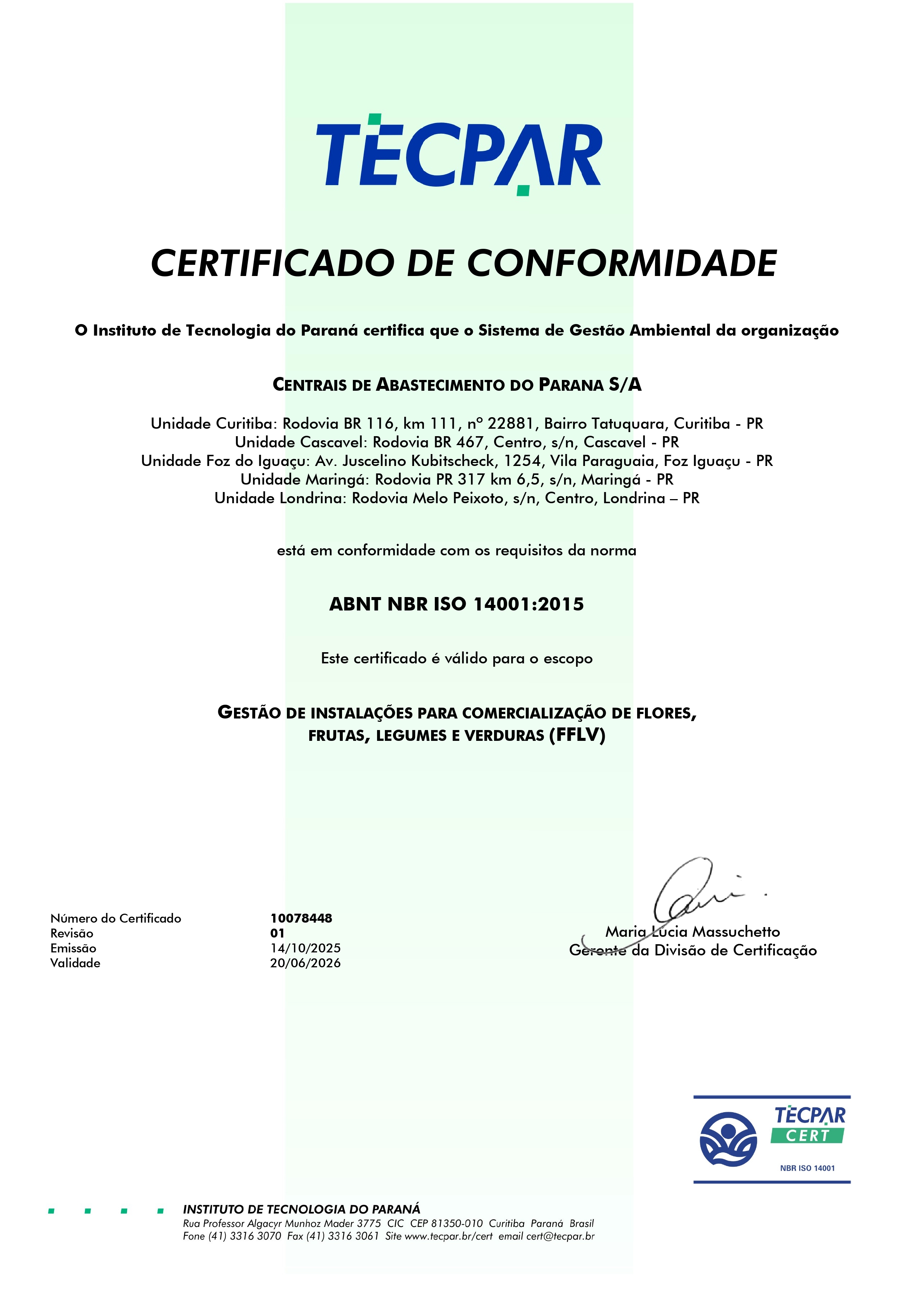 “A certificação de todas as unidades da Ceasa Paraná pela NBR ISO 14001:2015 é um marco histórico para a nossa instituição e um motivo de orgulho para todos os colaboradores. Essa conquista representa o reconhecimento de que nossas operações em todo o estado estão alinhadas a padrões internacionais de excelência em gestão ambiental”, afirmou o diretor-presidente Eder Eduardo Bublitz, em mensagem enviada a todos os colaboradores.