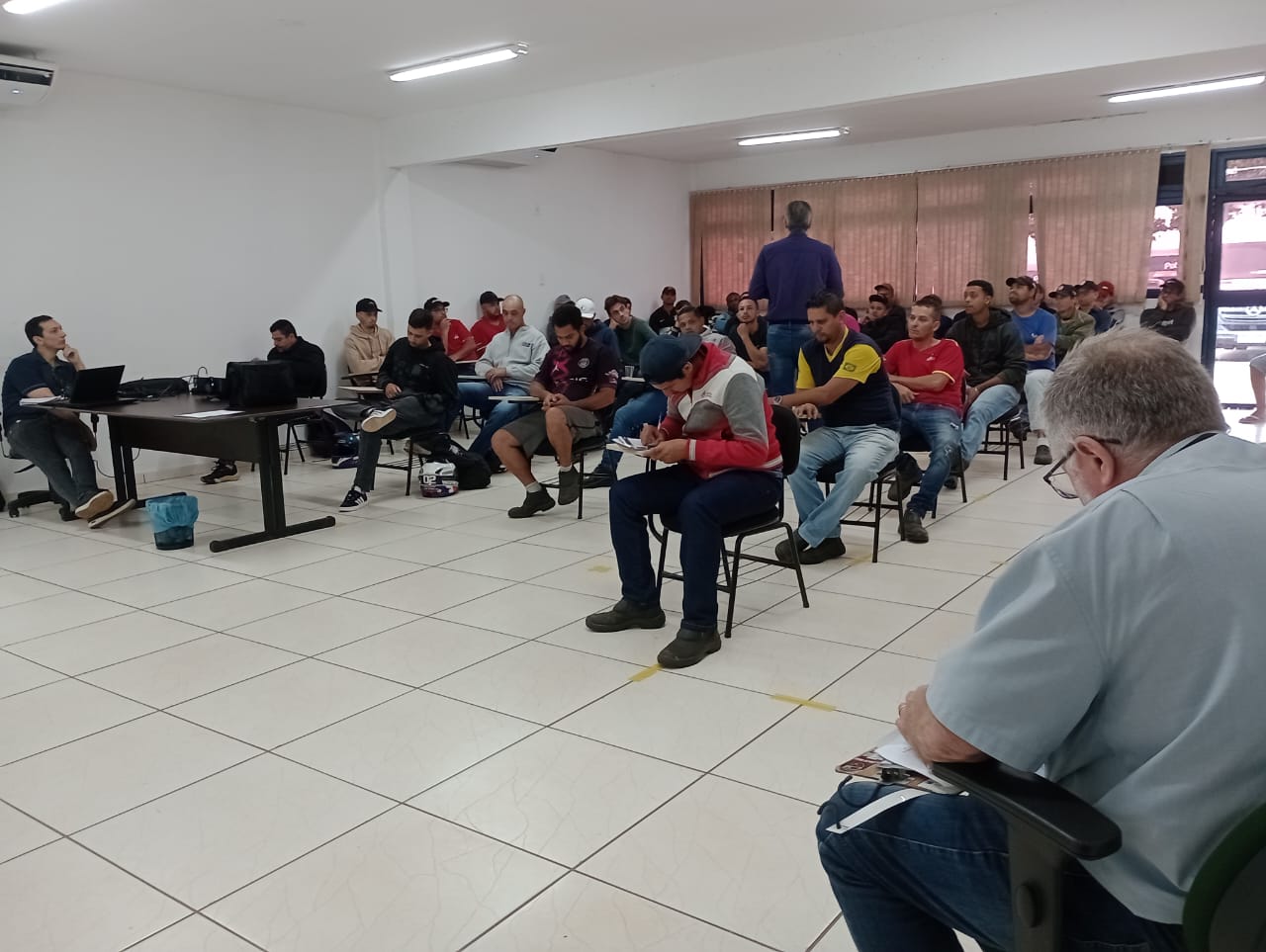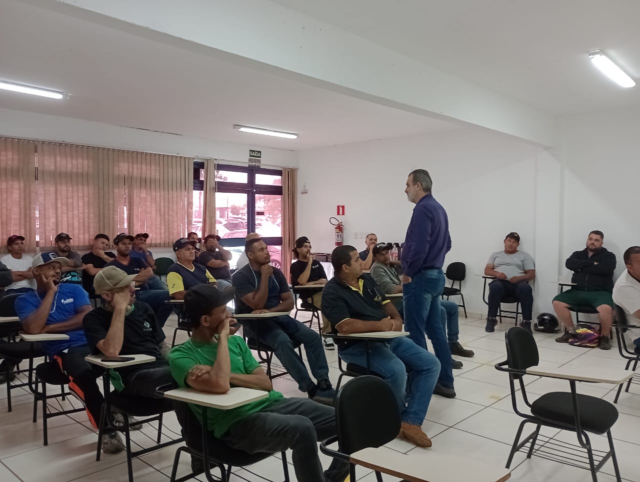 Participaram do treinamento 78 operadores de empilhadeira, distribuídos em 32 empresas permissionárias. A palestra foi conduzida por Roberto de Oliveira, Coordenador de Desenvolvimento Profissional do SESTSENAT. Foram abordados temas sobre a responsabilidade que o operador deve ter quando está dirigindo o equipamento e a obrigatoriedade de possuir a habilitação e renová-la a cada dois anos.
